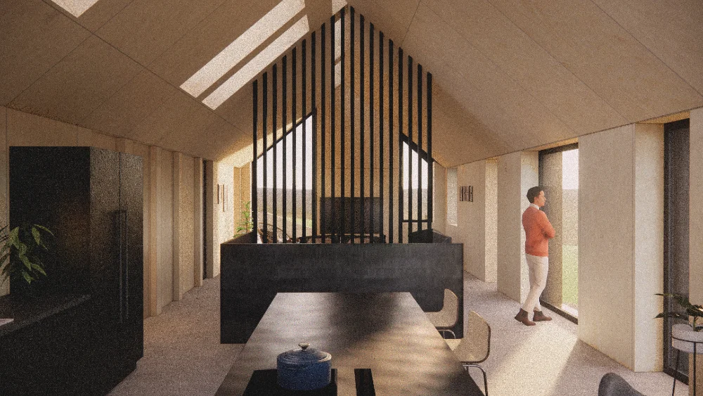 The design uses a combination of local Whinstone and contemporary zinc cladding on the roof and walls. The structure is a SIPS panel system to create the highest thermal performance and airtight envelope.