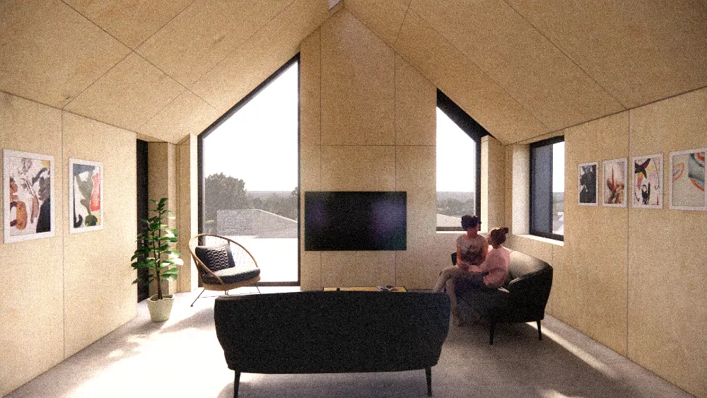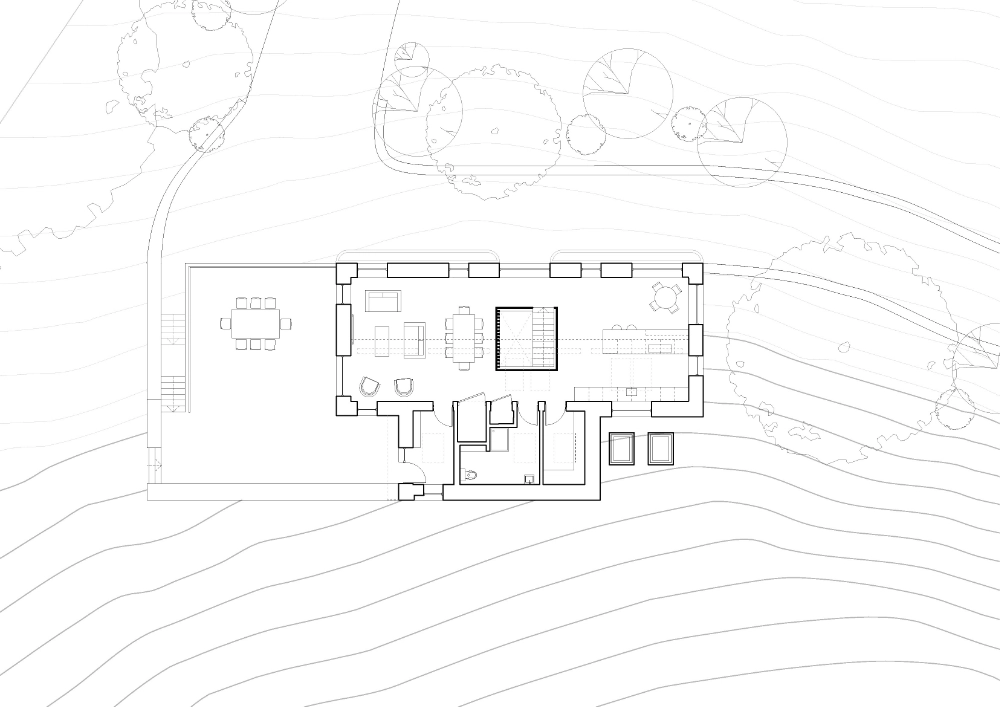Our solution cuts into the hill to create natural thermal mass and locates the living spaces on the first floor, taking best advantage of the views and the ability to enjoy the height created by opening up into the roof space.