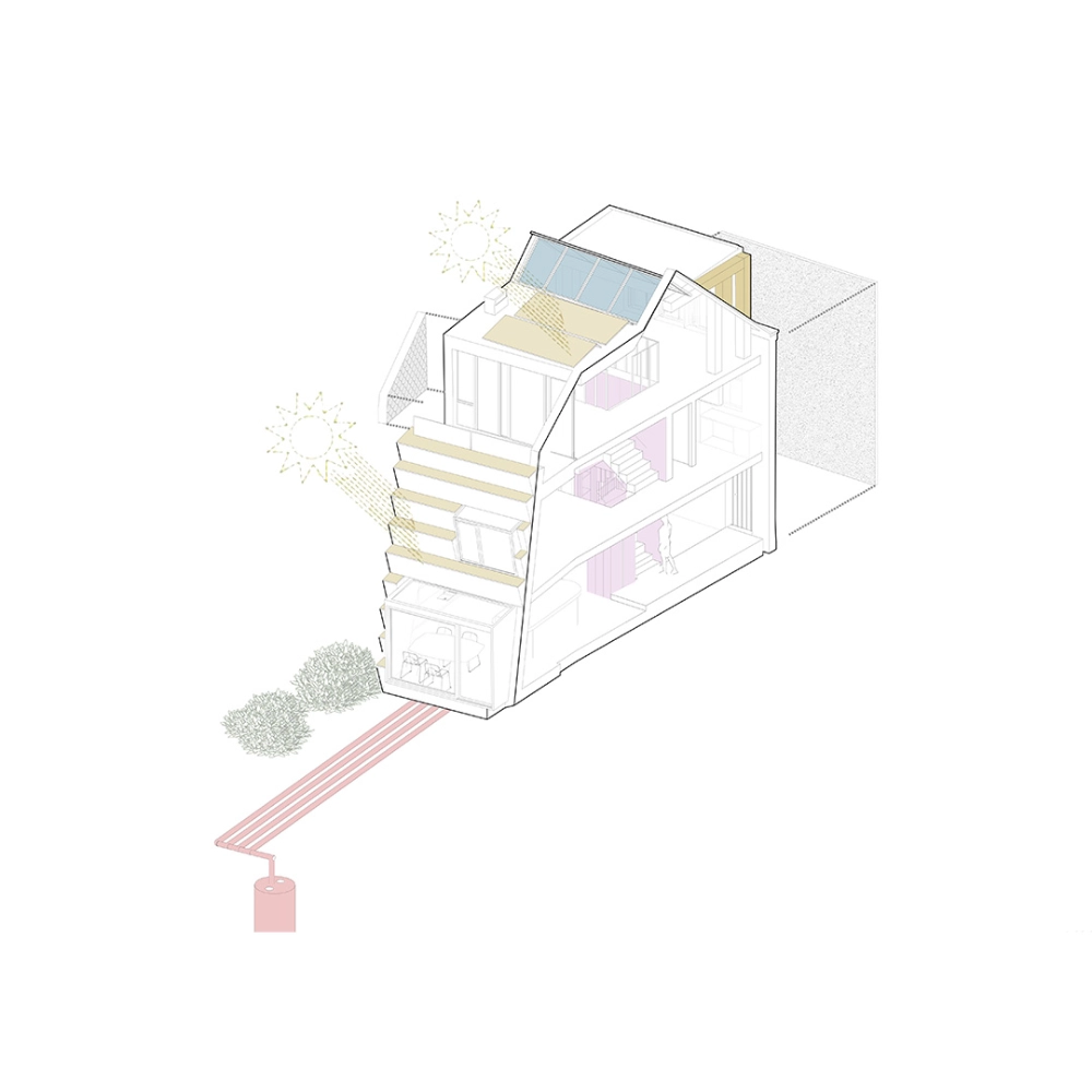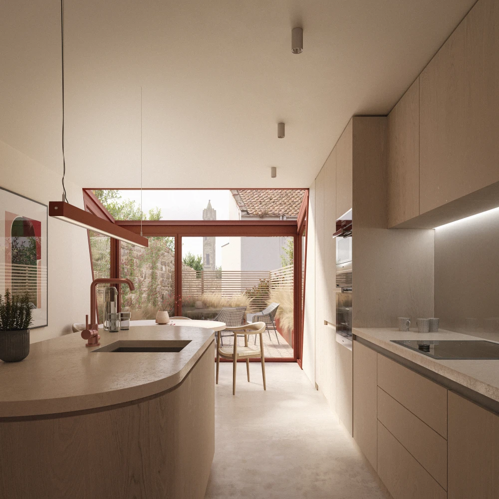 This coastal new build in St Andrews is a bold, sustainability-driven project set within a narrow, terraced plot. Designed in close collaboration with a highly ambitious client, the home integrates a range of innovative environmental strategies to create a low-impact, energy-positive dwelling.