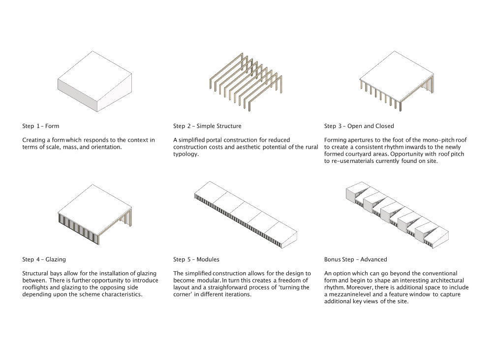 The scheme includes potential shared facilities, a communal courtyard, and efficient layouts that can accommodate mezzanine levels where needed. Sustainability, simplicity, and long-term adaptability are central to the project’s intent, ensuring it sits comfortably within its agricultural setting.