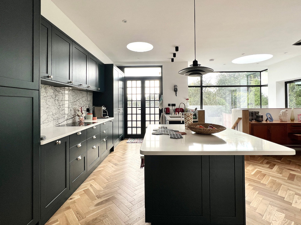 The design proposal included a loft extension with 2 bedrooms and shower room plus the new lower floor where we took advantage of the sloping site to create a double height space which can be viewed from the kitchen and dining room above. We have also incorporated a home office on the lower floor with views out to the garden.
