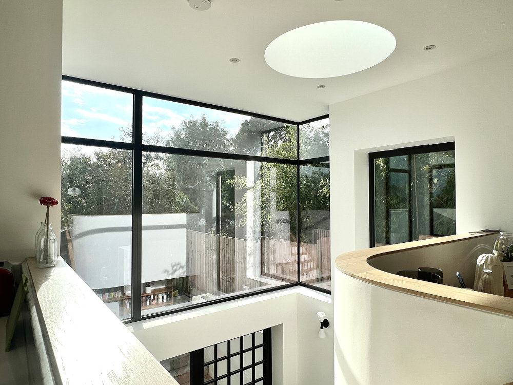 Circular roof lights bring light into the double height space and the kitchen. These spaces were possible due to a new steel frame added after the rear elevation had been entirely removed.
