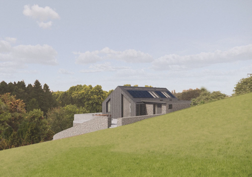 The design uses a combination of local Whinstone and contemporary zinc cladding on the roof and walls. The structure is a SIPS panel system to create the highest thermal performance and airtight envelope.
