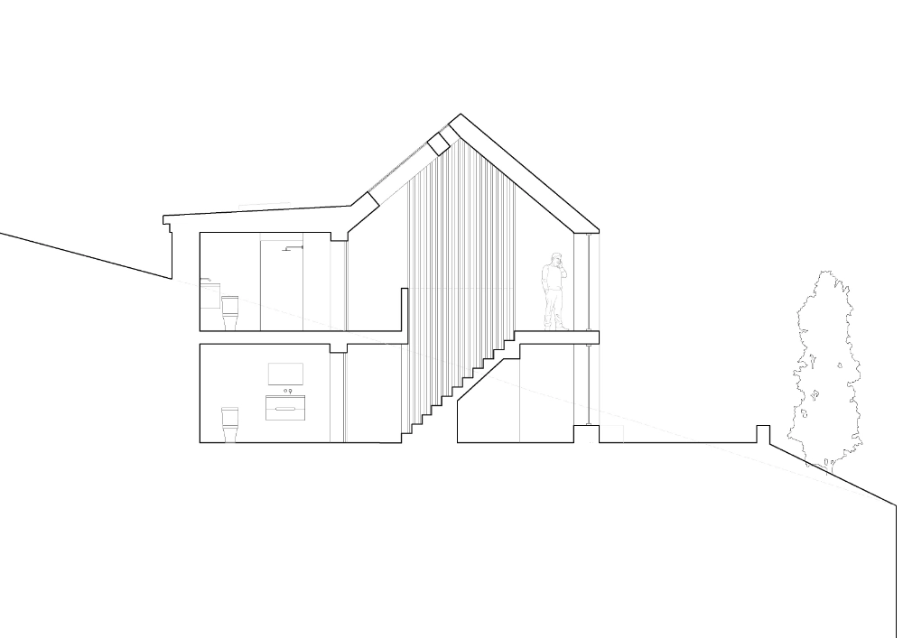 Our solution cuts into the hill to create natural thermal mass and locates the living spaces on the first floor, taking best advantage of the views and the ability to enjoy the height created by opening up into the roof space.