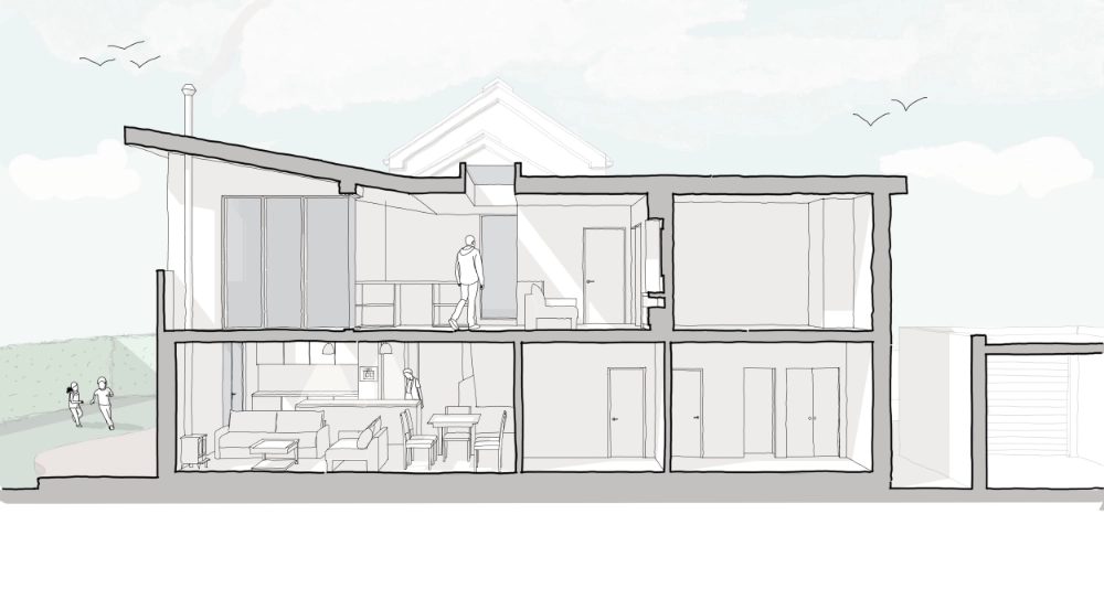 The final concept design looked to remove the existing pitched roof to create a new first floor with a double height space above the kitchen. The extra storey would provide an extra living room, 2 bedrooms, an extra bathroom plus utility space. Almost doubling their current accommodation.