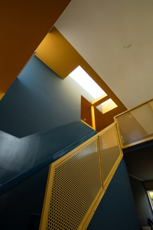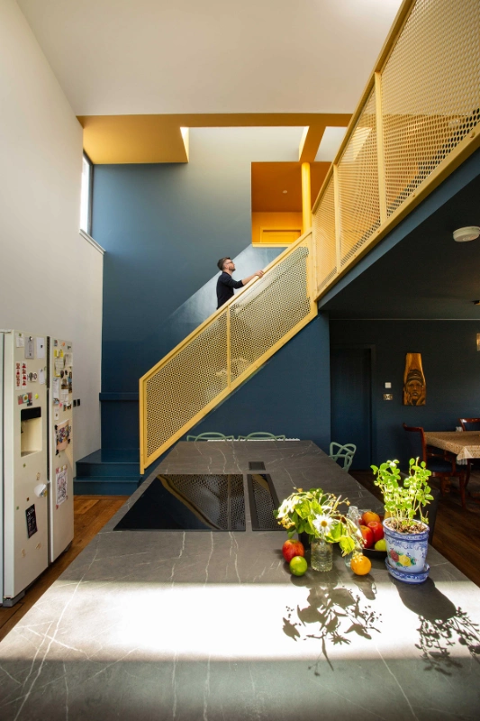We carefully curated a bold and colourful open-planned kitchen, living, and dining space. Amply illuminated with natural daylight, this space is central to the young family and has entirely altered their way of living in the house.